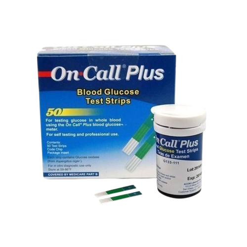 The On Call® Plus Blood Glucose Test Strips are thin strips with a chemical reagent system. They work with the On Call® Plus Blood Glucose Meter to measure the glucose concentration in whole blood. Blood is applied to the end tip of the test strip. The blood is then automatically absorbed into the reaction cell. The reaction takes place in the reaction cell. A transient electrical current is formed during the reaction which is detected by the meter. The blood glucose concentration is then calculated based on the electrical current. The result is then shown on the meter display. The meters are calibrated to display plasma equivalent results. For in vitro diagnostic use. Test strips are only to be used outside the body for testing purposes, for the quantitative measurement of glucose in capillary whole blood from the finger, forearm and palm, by people with diabetes at home and by healthcare professionals as an aid in monitoring the effectiveness of diabetes control programs.